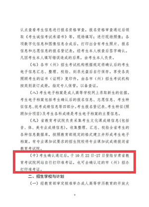 (七)考生確認通過后,于10月22日-27日登陸甘肅省教育考試院網站自行打印準考證,也可去確認過的市(州)招辦打印準考證。