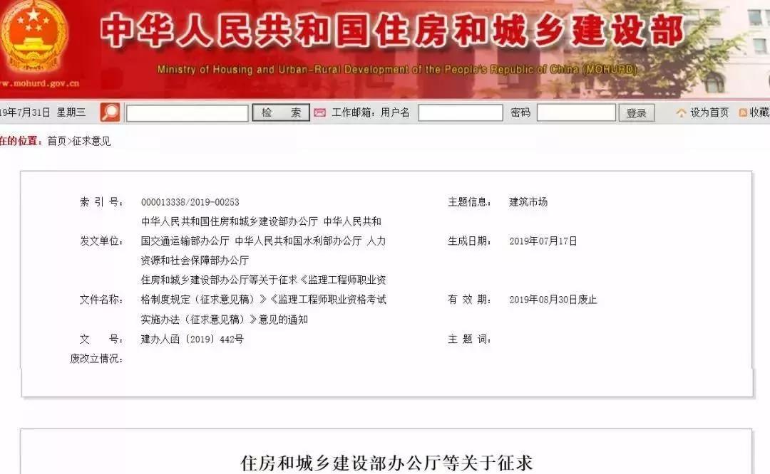 近日,住房和城鄉建設部辦公廳、人力資源和社會保障部辦公廳、交通運輸部辦公廳、水利部辦公廳聯合下發《監理工程師職業資格制度規定(征求意見稿)》和《監理工程師職業資格考試實施辦法(征求意見稿)》。