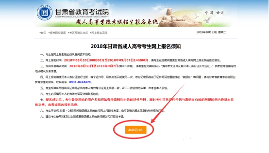 二、新冠肺炎確診病例、無癥狀感染者、疑似患者、確診病例密切接觸者等“四類人員”不得參加考試。三、考生進入考點、考場時不得因為佩戴口罩影響身份識別。考試期間,考生自備口罩。考生在進入考場前必須佩戴口罩,進入考場后建議考生全程佩戴口罩。隔離考場的考生必須全程佩戴口罩。四、考試期間,考生必須嚴格遵守《2020年甘肅省成人高考防疫工作方案》要求和成人高考相關規定,完全服從考點工作人員安排。五、10月21日起,考生登錄甘肅省教育考試院網站自行打印準考證(具體打印流程見第八條)。同時打印《2020年甘肅省成人高考考生安全考試承諾書及身體健康狀況監測表》(見附件2),并簽字確認,于第一場考試時交監考人員。六、考生不得提供身體健康狀況虛假信息。對于隱瞞行程、隱瞞病情、故意壓制癥狀、瞞報漏報健康情況的考生,一經發現,一律不得參加考試,并追究本人及相關人員的責任。七、開考15分鐘后考生不得進入考場,離考試結束前30分鐘方準交卷離場。1、瀏覽器搜索http://www.ganseea.cn/進入甘肅省教育考試院官方網站;