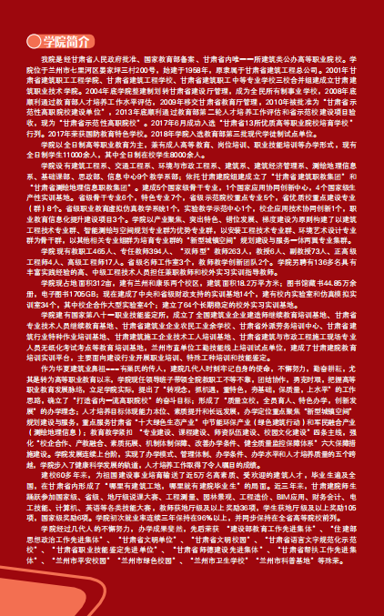 我院是經(jīng)甘肅省人民政府批準、國家教育部備案、甘肅省內(nèi)唯一一所建筑類公辦高等職業(yè)院校。學院位于蘭州市七里河區(qū)晏家坪三村200號,始建于1958年,原隸屬于甘肅省建筑工程總公司。2001年甘肅省建筑職工工程學院、甘肅省建筑工程學校、甘肅省建筑職工中等專業(yè)學校三校合并組建成立甘肅建筑職業(yè)技術(shù)學院。2004年底學院整建制劃轉(zhuǎn)甘肅省建設(shè)廳管理,成為全民所有制事業(yè)學校,2008年底順利通過教育部人才培養(yǎng)工作水平評估,2009年移交甘肅省教育廳管理,2010年被批準為“甘肅省示范性高職院校建設(shè)單位”,2013年底順利通過教育部第二輪人才培養(yǎng)工作評估和省示范校建設(shè)項目驗收,現(xiàn)為“甘肅省示范性高職院校”。2017年6月成功入選“甘肅省13所優(yōu)質(zhì)高等職業(yè)院校培育學校”行列。2017年榮獲國防教育特色學校。2018年學院入選教育部第三批現(xiàn)代學徒制試點單位。