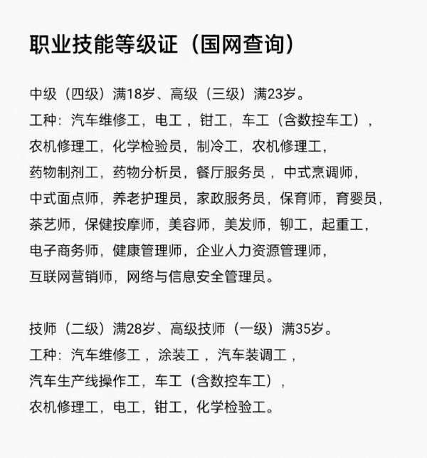 依據國家職業標準,社會培訓評價職業技能等級分五級,分別為初級工(五級)、中級工(四級)、高級工(三級)、技師(二級)、高級技師(一級)。其中,高級職稱相當于高級技師(一級)職業技能等級證,中級職稱相當于技師(二級)職業技能等級證,初級職稱相當于高級工(三級)職業技能等級證