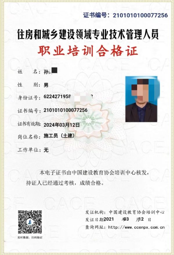施工員證書考試通過后由中國建設教育協會頒發土建施工員證書,自2018年3月1日起,所有協會會員頒發的培訓結業證書加蓋會員單位(具有辦學資質單位)印章和技術支持單位“中國建設教育協會培訓中心”印章。其他樣式證書均為偽造證書。原證書依然有效。中國建設教育協會審核成績無誤后一周內開始印發合格證書,成績合格者將在1個月頒發證書。